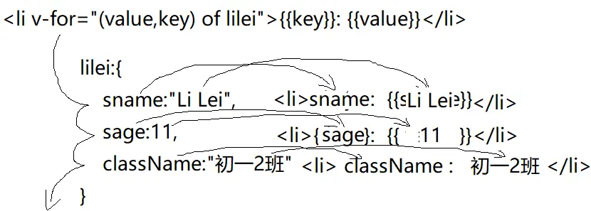 <li v-for="(value,key) of lilei" :key="key">{{key}}: {{value}}</li>