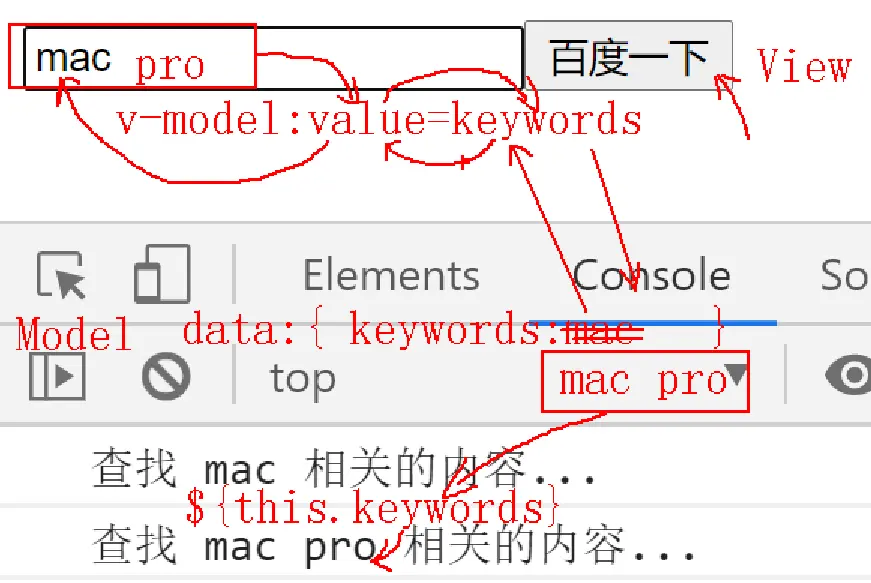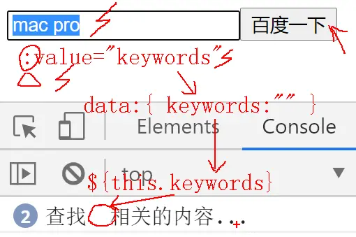 <input v-model:value="keywords"><button @click="search">百度一下</button>