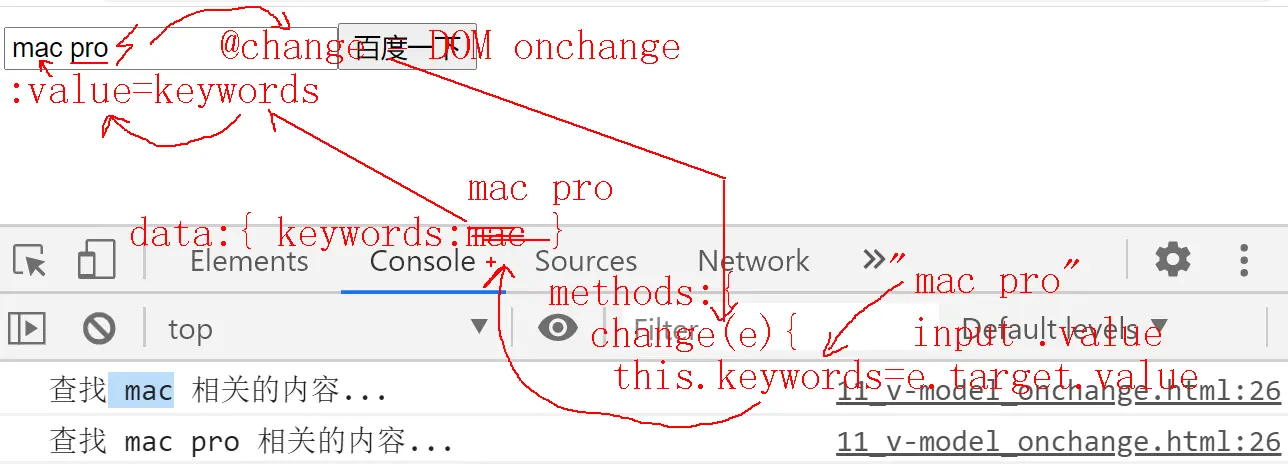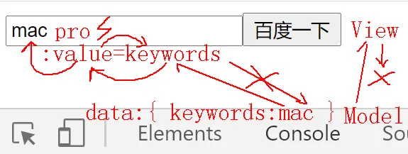 <input :value="keywords" @change="change"><button @click="search">百度一下</button>