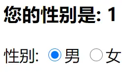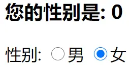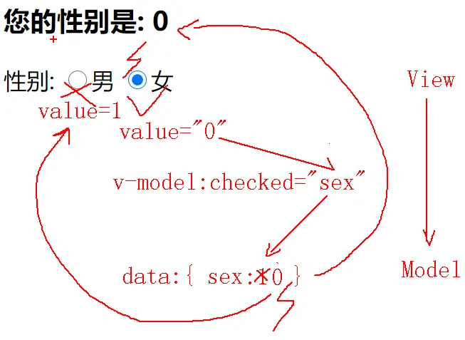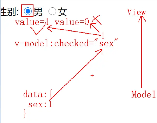 又因为无论用户点哪个input,修改的都是性别这一个属性值,所以两个radio绑定时都绑定sex一个变量-->