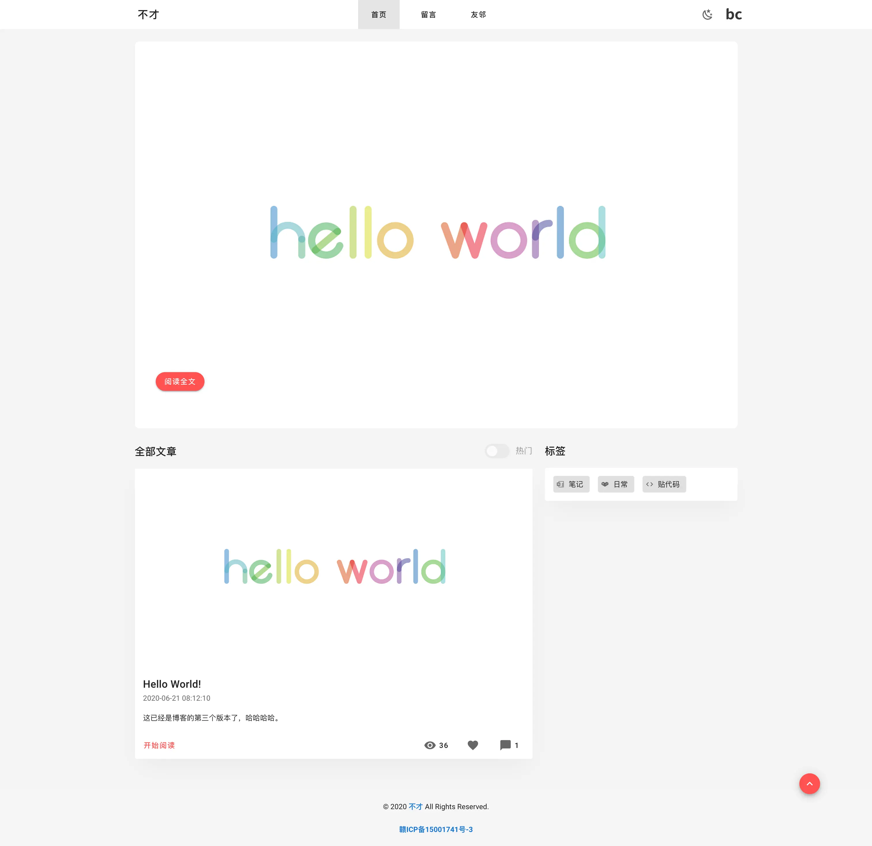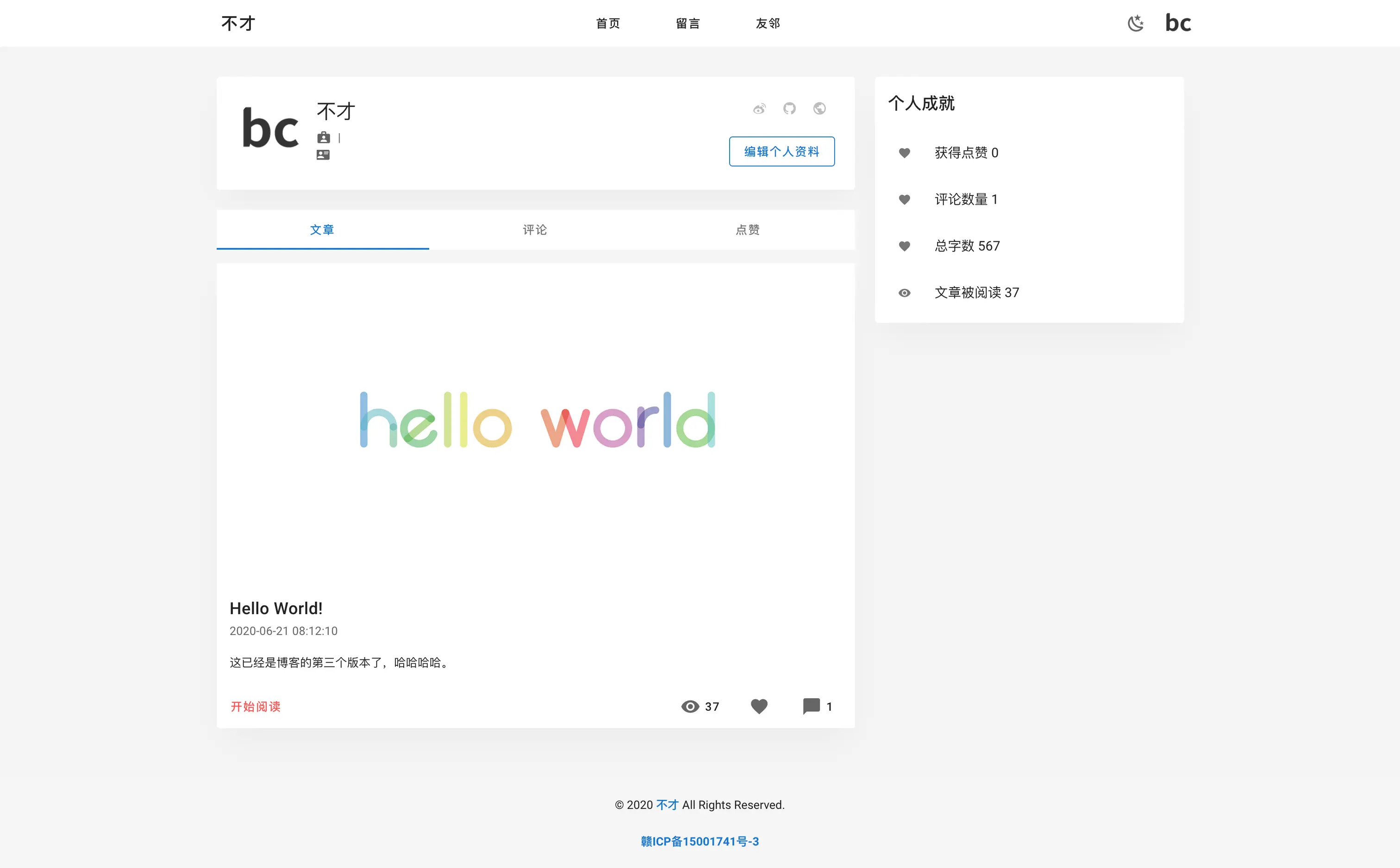 第二版是koa+mongo+ejs+bootstrap+jquery+layui 目前还在运行中,将文章迁移后就准备重定向到新站了[githubh2.0] [线上地址]。