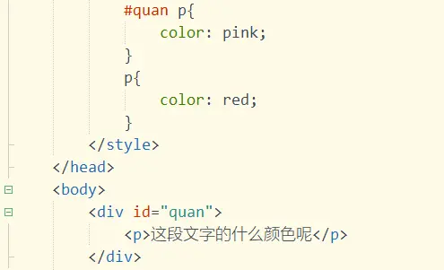 如果p标签被选中了,则id+标签选择器的权重为:0101,大于p标签的权重:0001,所以会显示为pink样式