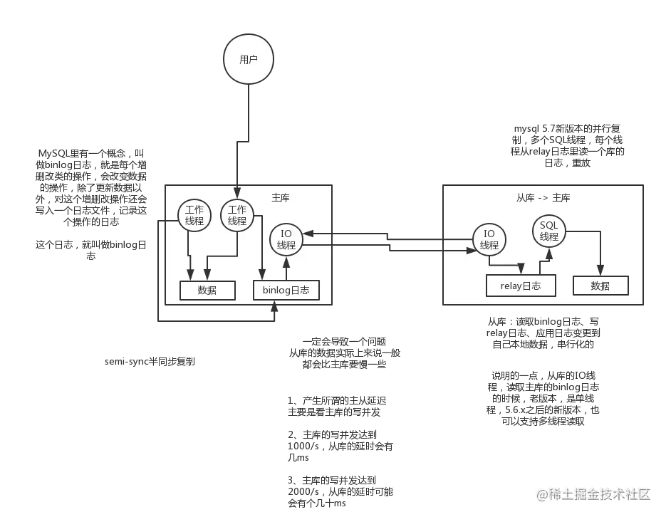 这里有一个非常重要的一点,就是从库同步主库数据的过程是串行化的,也就是说主库上并行的操作,在从库上会串行执行。所以这就是一个非常重要的点了,由于从库从主库拷贝日志以及串行执行SQL的特点,在高并发场景下,从库的数据一定会比主库慢一些,是有延时的。所以经常出现,刚写入主库的数据可能是读不到的,要过几十毫秒,甚至几百毫秒才能读取到。