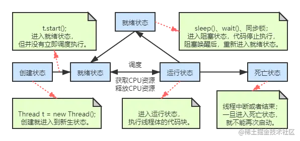 线程五大状态:创建、就绪、运行、阻塞、死亡