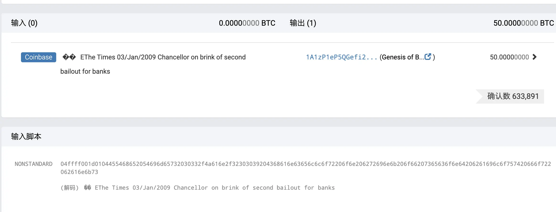 创世区块包含一个隐藏的信息。在其Coinbase交易的输入中包含这样一句话“The Times 03/Jan/2009 Chancellor on brink of second bailout forbanks.”这句话是泰晤士报当天的头版文章标题,引用这句话,既是对该区块产生时间的说明,也可视为半开玩笑地提醒人们一个独立的货币制度的重要性,同时告诉人们随着比特币的发展,一场前所未有的世界性货币革命将要发生。该消息是由比特币的创立者中本聪嵌入创世区块中。