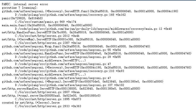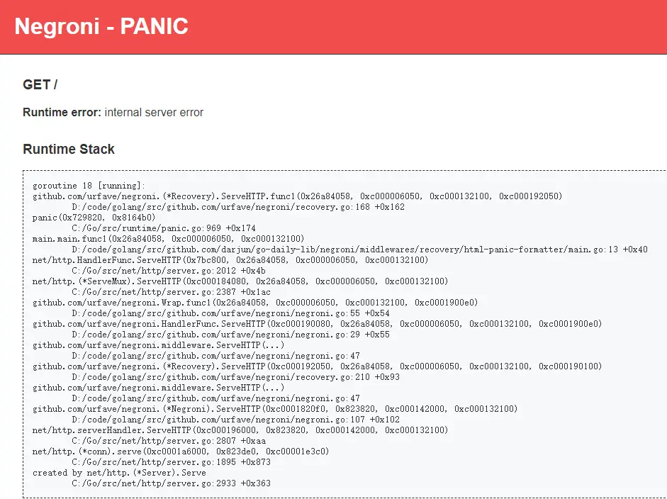 我们还可以对输出的格式进行设置,设置Formatter字段为negroni.HTMLPanicFormatter能让输出更好地在浏览器中呈现: