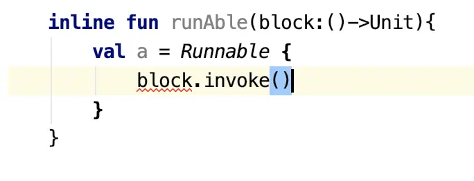 上面代码使用了咱们非常熟悉的 Runnable ,但是发现报错了,为什么呢?上面已经说出了答案,这就是 crossinline 关键字的作用,可以让无法使用内联函数的函数来使用内联函数: