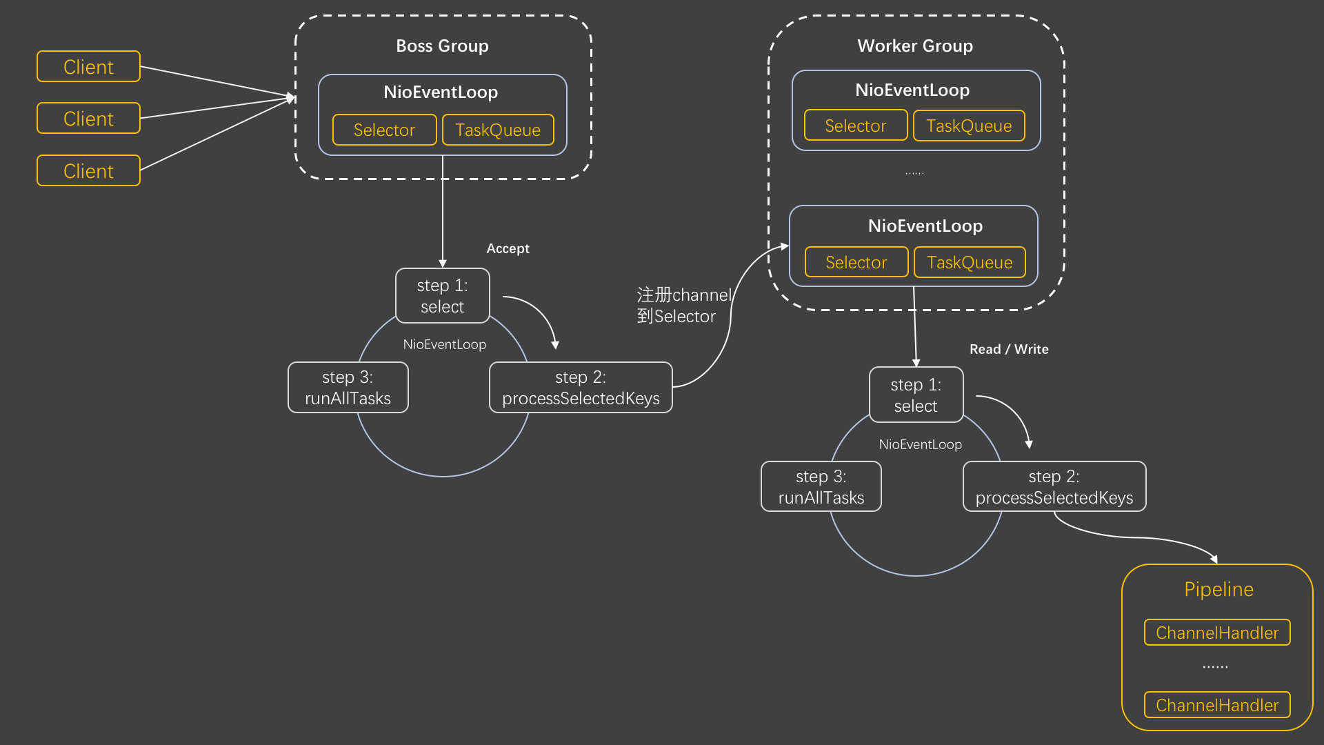 下面的蓝色圆圈就是 NioEventLoop 的执行步骤, 当客户端进行连接 BossGroup 就会轮询到 accept 事件, 然后封装成 NioSocketChannel 并注册到 WorkerGroup 的某个线程中的 Selector 中, 至于具体注册到哪个线程会根据算法获取, 最后执行任务队列中的任务.