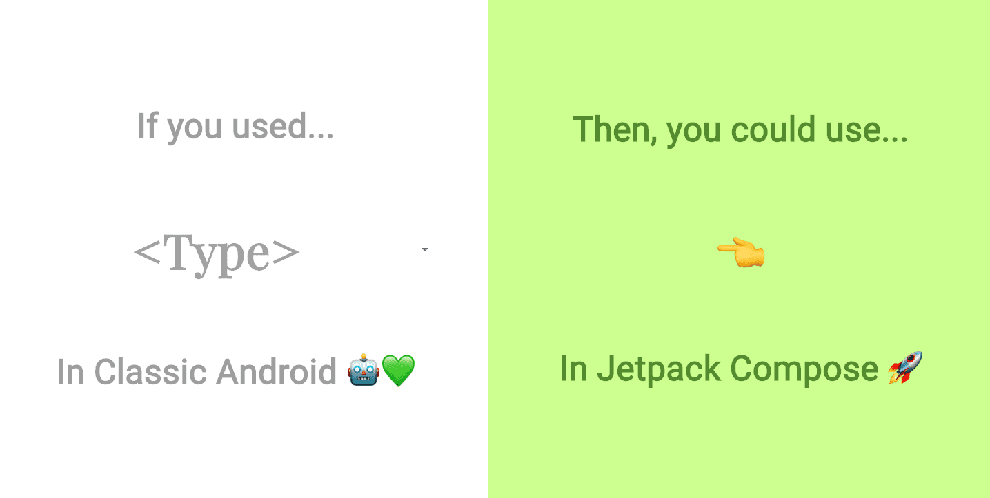 Here's a handy tool that lets you input a traditional Android view type, and it tells you what the equivalent Jetpack Compose component is.