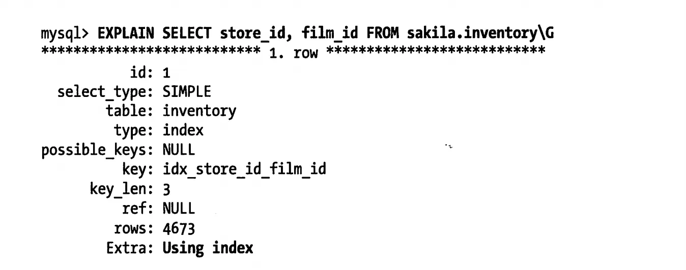 例如,表inventory有一个多列索引(store_id,film_id)。如果只访问这两列,就可以使用这个索引做覆盖索引: EXPLAIN SELECT store_id,film_id FROM inventory;