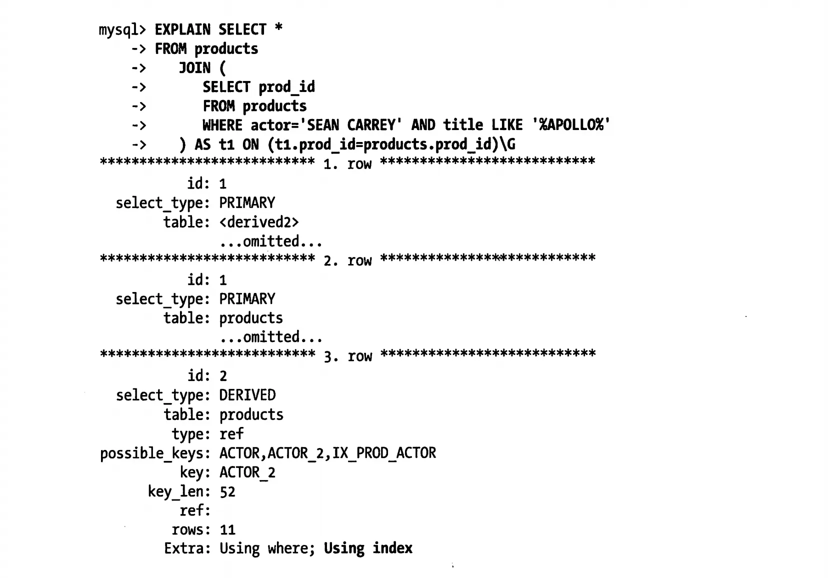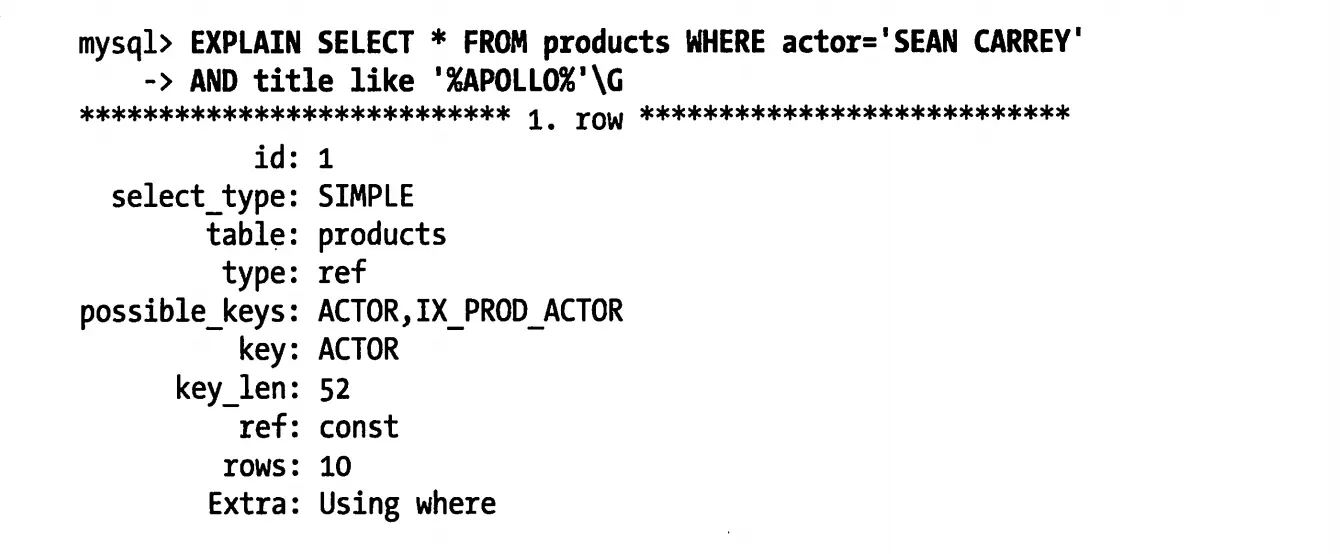 但是如果是下面这种查询语句,那么就不会使用覆盖索引了: EXPLAIN SELECT * FROM inventory WHERE actor='sean carrey' AND title like '%apollo'
