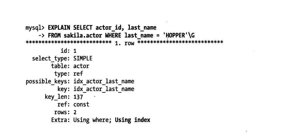 例如,actor使用InnoDB存储引擎,并在last_name字段有二级索引,虽然该索引的列不包括主键actor_id,但也能够用于对actor_id做覆盖查询