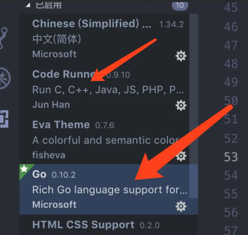 随后是编辑器的推荐,对于初学者来说,这里还是力推vscode,因为它简单灵活,不需要各种复杂解释器的配置,只需要安装 CodeRunner和Go这两个插件就足以支撑你敏捷编写go lang了