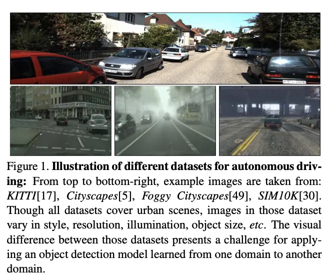 以自动驾驶为例,不同的公开数据集里的图片存在较大的差异,域偏移问题会导致明显的检测器性能下降。尽管收集更多的训练图片能解决域偏移的影响,但显然这不是最好的方案。