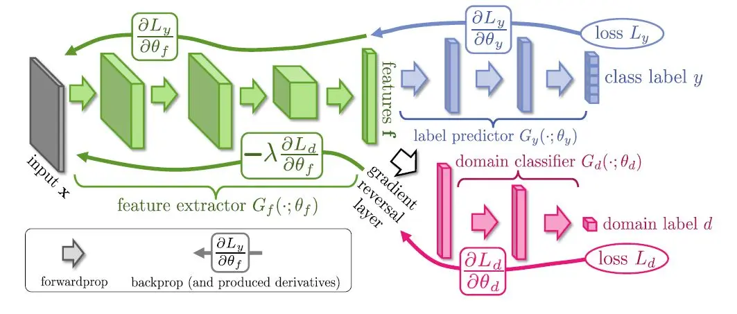 为了对齐域分布,需要同时优化域分类器最小化域分类损失以及优化主干网络的参数最大化域分类损失进行对抗训练,论文采用GRL进行实现,使用梯度下降来训练域分类器,回传梯度给主干时将梯度置为反符号。