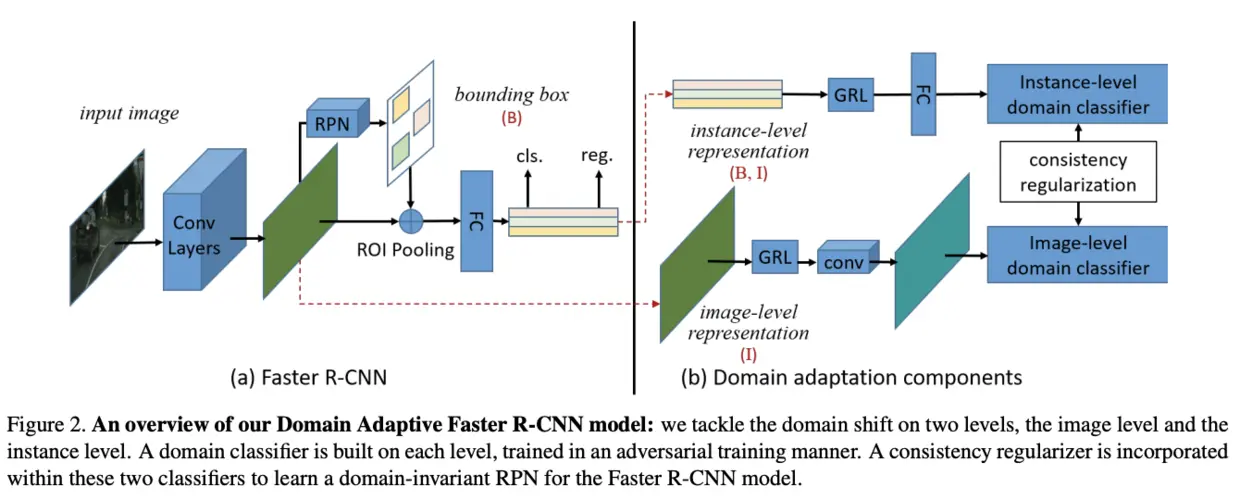 DA Faster R-CNN的架构如图2所示,包含两个域自适应模块以及一致性正则化模块,自适应模块加入GRL(gradient reverse layer)进行对抗训练,每个模块包含一个域分类器,最终的损失函数为