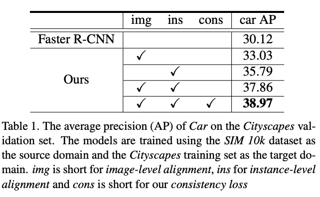 SIM 10k是从GTAV中截取画面进行标注的数据集,Cityscapes为真实图片,这里对比从生成图片到真实图片的域转移。