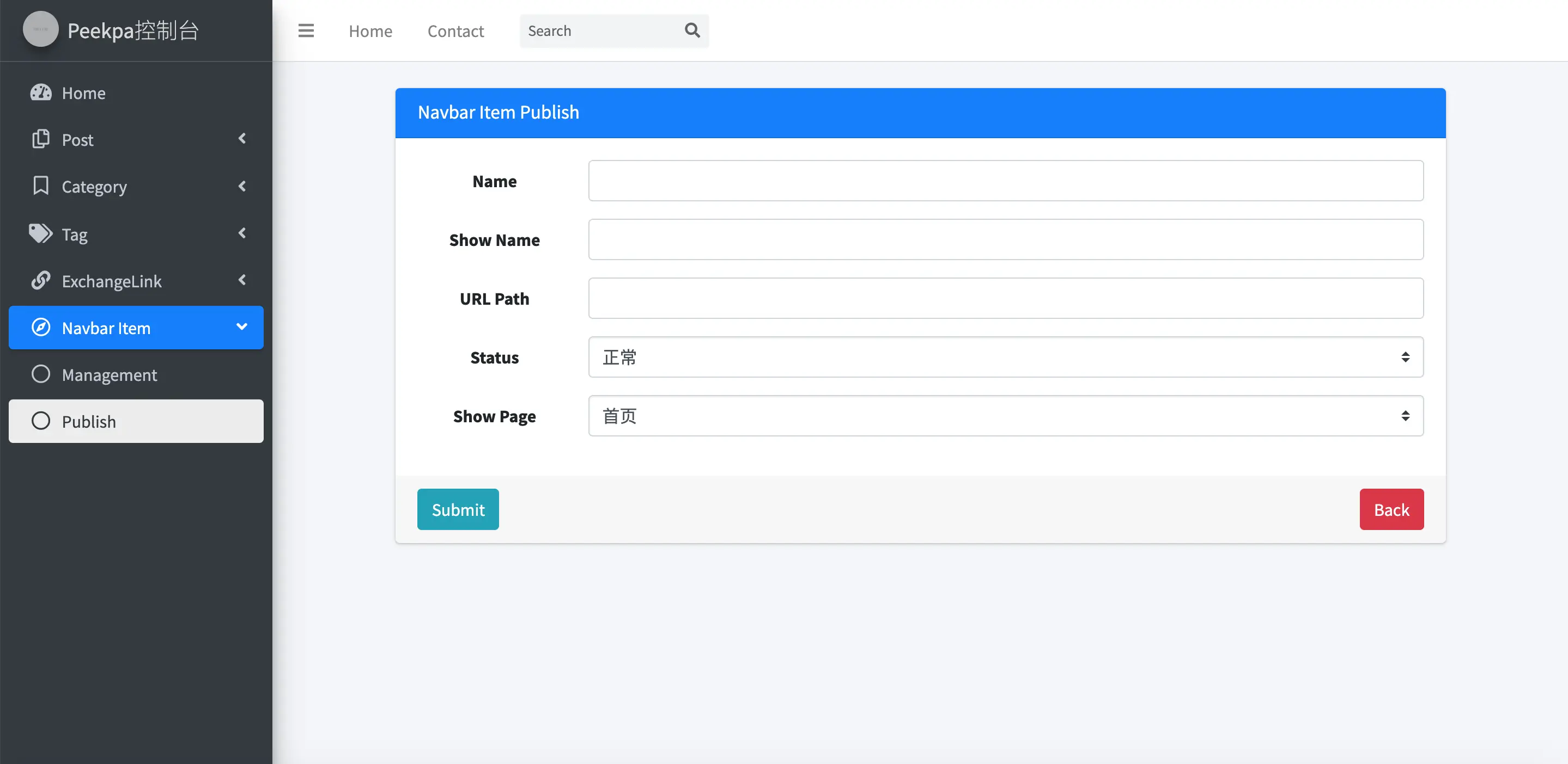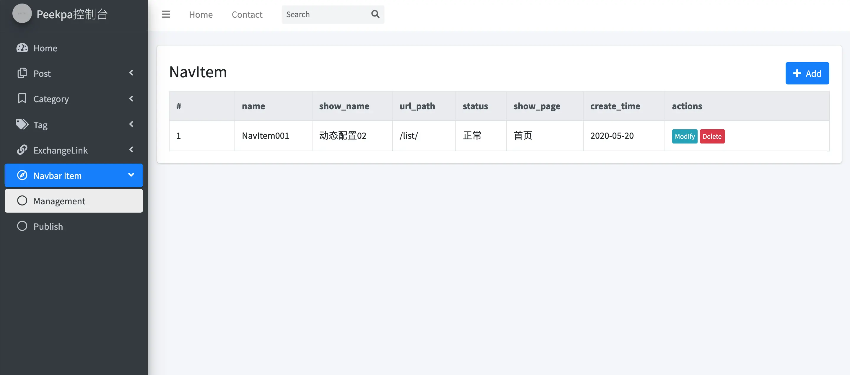 后台管理还是和之前一样,在cms下创建navitem,然后是管理页面和发布页面。当html页面创建好之后,就要编写视图函数,最后页面基本长这两个样子,管理页面: