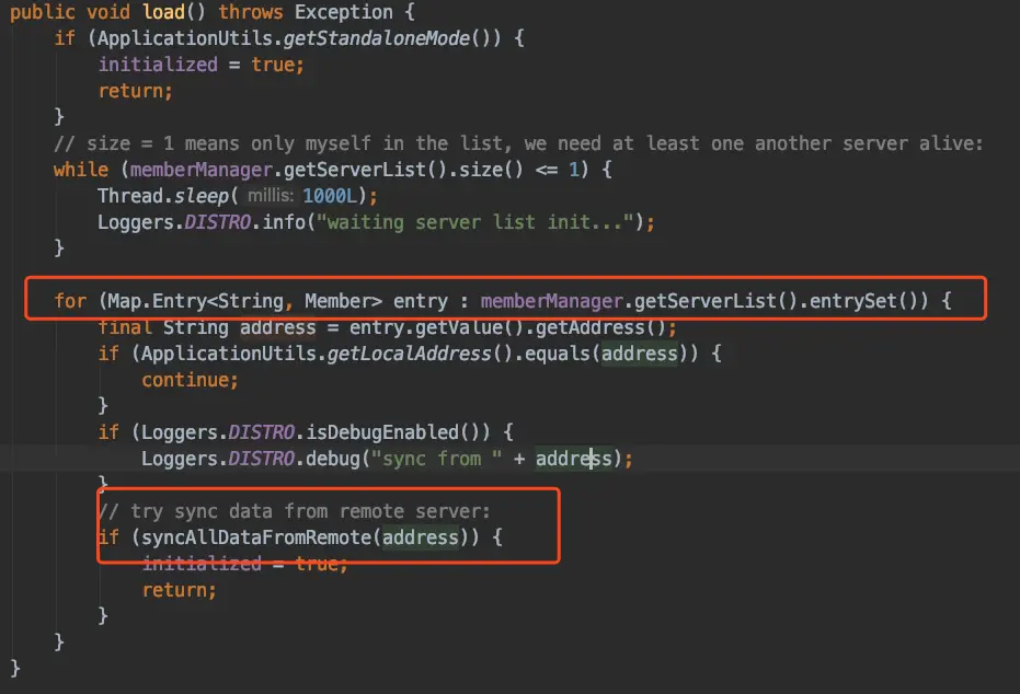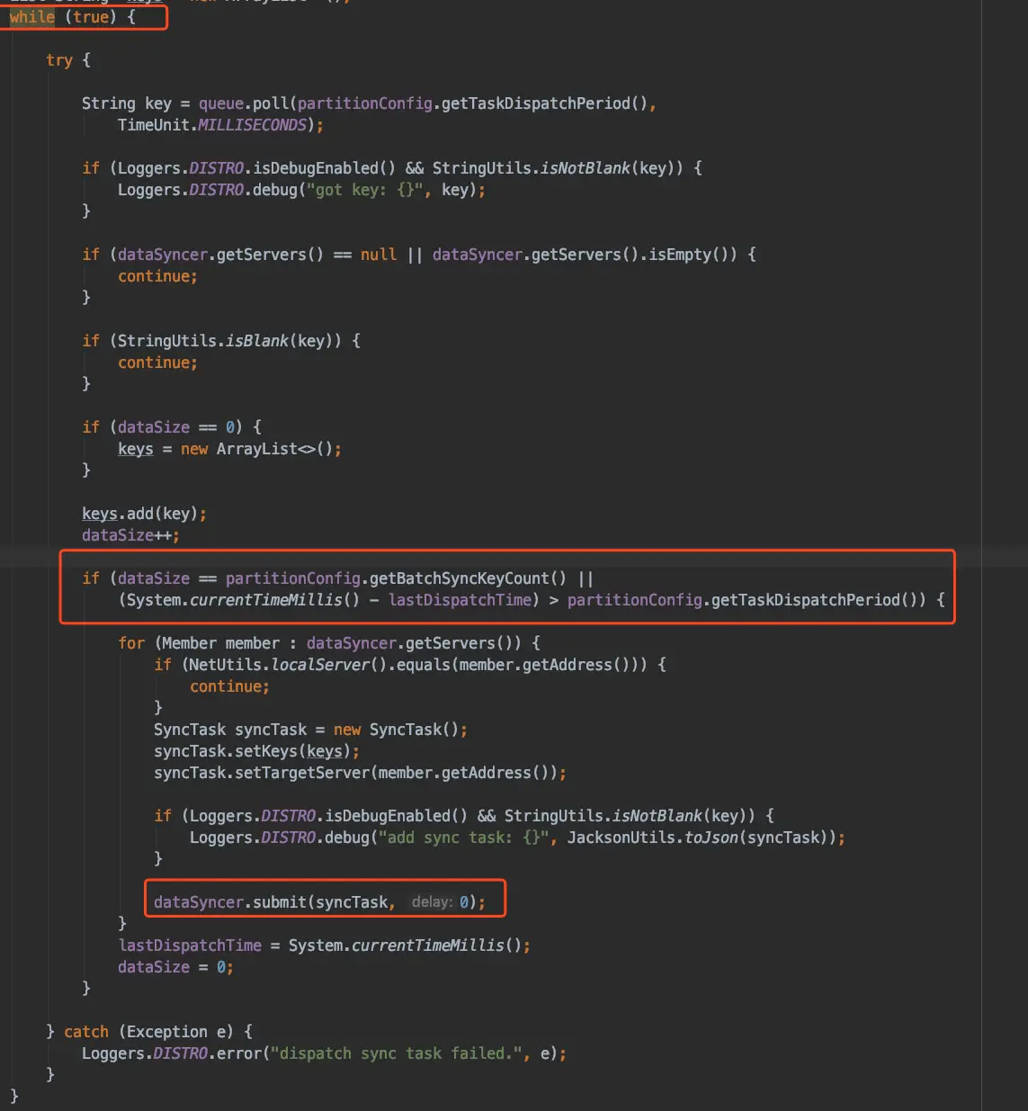 这个时候有同学会问,如果我某个机器刚刚上线,刚好没有收到更新的这个数据这个怎么办呢?在Nacos中也会有一个兜底的策略TimedSync,这个任务每5s会执行一次,具体的执行任务代码如下: