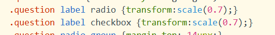 修改input的radio单选框和checkbox复选框的大小 Reve2333 2020-06-22 167 阅读1分钟 官方文档不支持修改单选框和复选框的大小 因此使用css3的属性transform:scale() 来进行修改 修改前 修改后 代码: