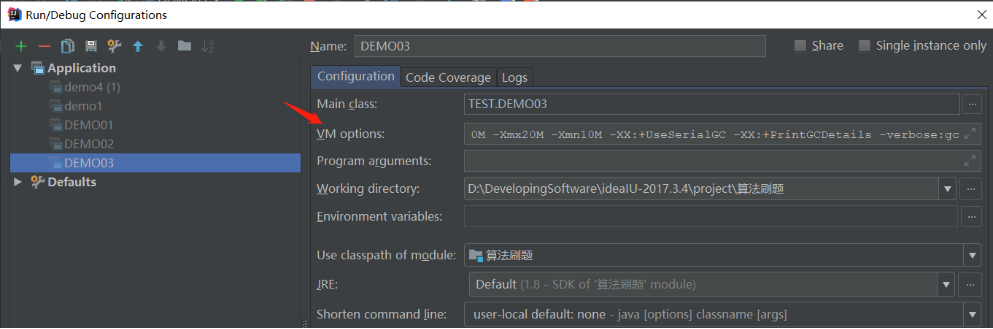 指定DEMO03运行时JVM参数,设置堆区为20M,新生代10M,使用Serial垃圾收集器