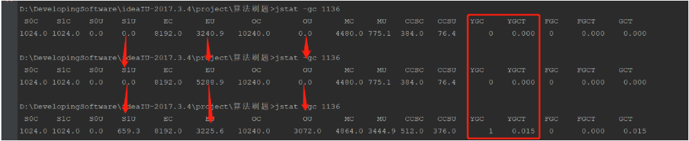 可以看到在三次打印中,Eden区发生的变化,发生了一次YoungGC,GC时间是0.015S
