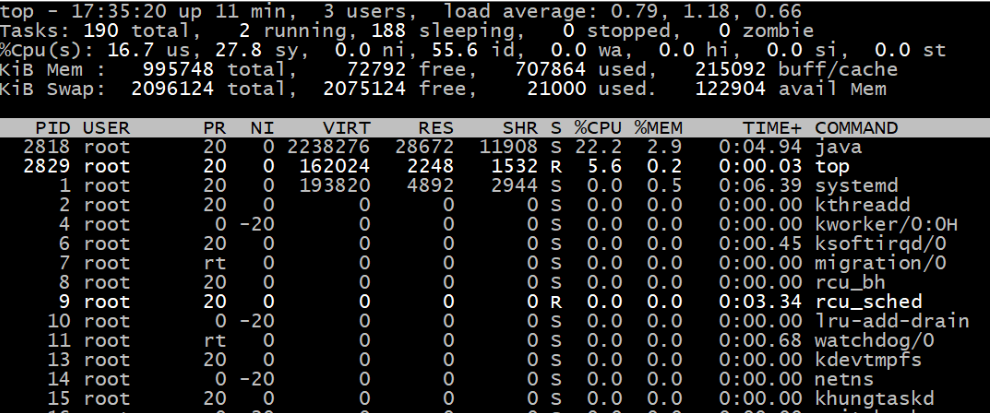查看系统状况:用top命令去查各个进程CPU、内存的资源消耗情况,找出最耗资源的进程pid,如图所示,最耗资源的是java进程,pid是2818【需要在后台运行很长时间才会有反应.....】