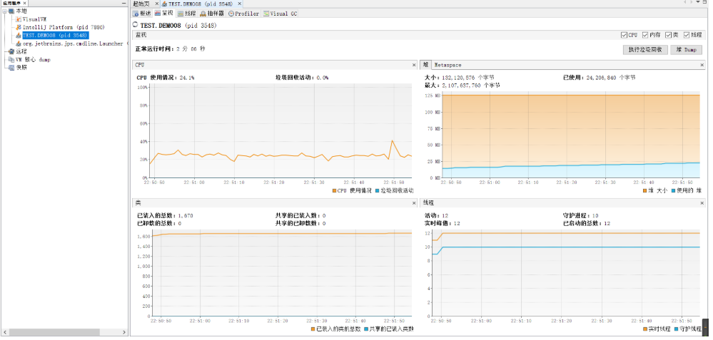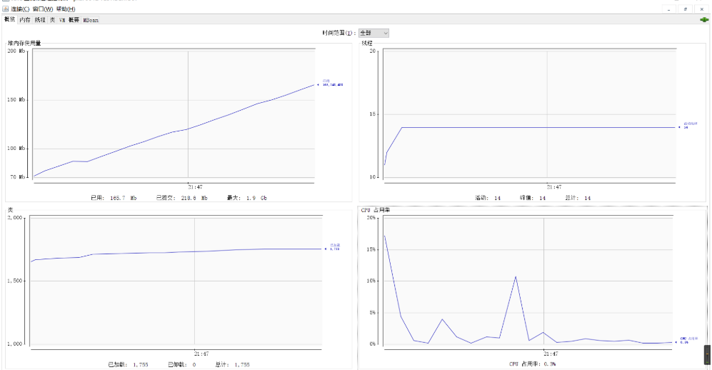 概览:主要运行数据的概览,包括堆内存,线程,类,CPU使用情况四项信息的变化趋势图