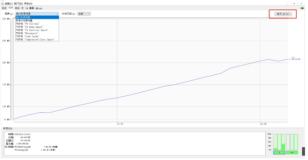 内存:JDK为1.8,使用的垃圾收集器为ParallerScavenge+Parallel Old,可以监视堆内存以及其中各个区域(Eden区,Survivor区,老年代)的变化趋势,还可以监视非堆(元空间)的内存变化趋势,相当于命令行中的jstat