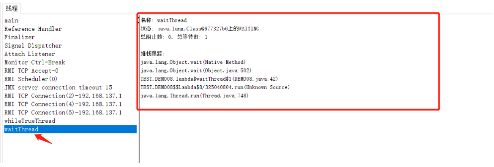 在去控制台回车开启等待线程观察线程情况,通过查看堆栈信息可以定位到具体哪一行