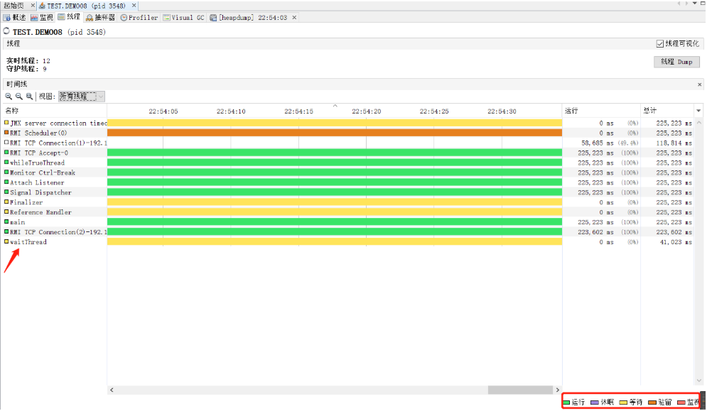 查看等待线程:黄色代表的是等待线程,点击线程Dump,即可查看线程的堆栈信息