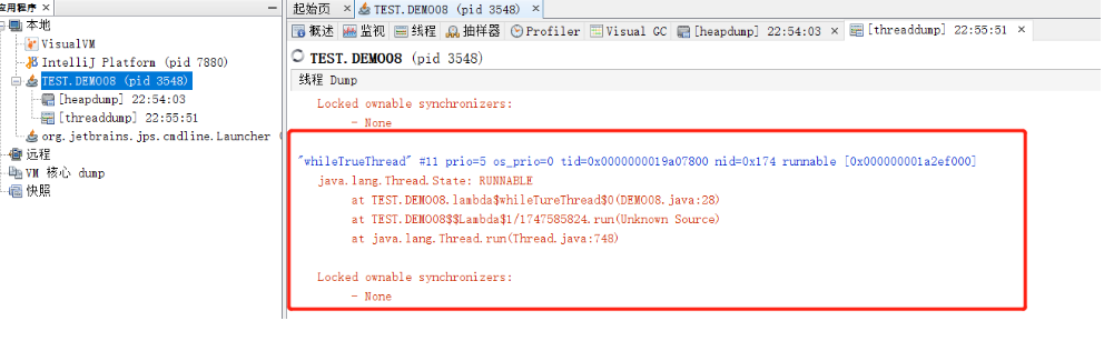 查看死锁线程,当开启死锁线程后,visualvm可以立即检测到,点击线程Dump,生成快照文件去查看堆栈详情。