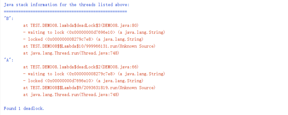 在去控制台回车开启死锁线程观察线程情况,通过查看堆栈信息可以发现A线程在等待B的锁,B线程在等待A的锁