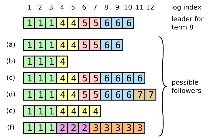 - e节点:<4,7>,任期号与索引都比leader小,因此既缺少日志,也有未提交的日志 f节点:<3,11>,任期号比leader小,所以缺少日志,而索引比leader大,这部分日志又是未提交的日志