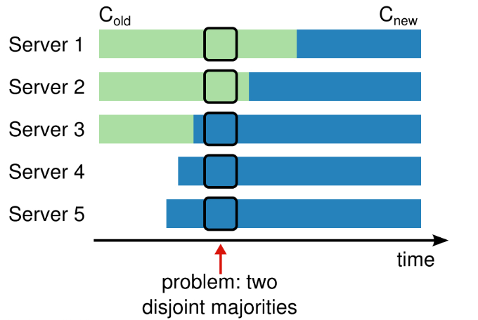 如下图所示,从Cold迁移到Cnew的过程中,因为各个节点收到最新配置的实际不一样,那么肯能导致在同一任期下多个Leader同时存在。