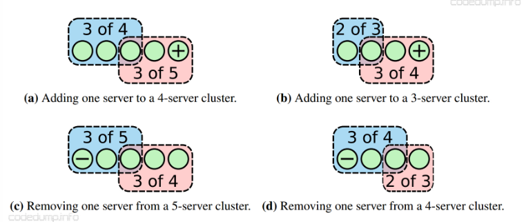 这个为什么安全呢?很容易枚举出所有情况,原有集群奇偶数节点情况下,分别添加和删除一个节点。在下图中可以看出,如果每次只增加和删除一个节点,那么Cold的Majority和Cnew的Majority之间一定存在交集,也就说是在同一个Term中,Cold和Cnew中交集的那一个节点只会进行一次投票,要么投票给Cold,要么投票给Cnew,这样就避免了同一Term下出现两个Leader。