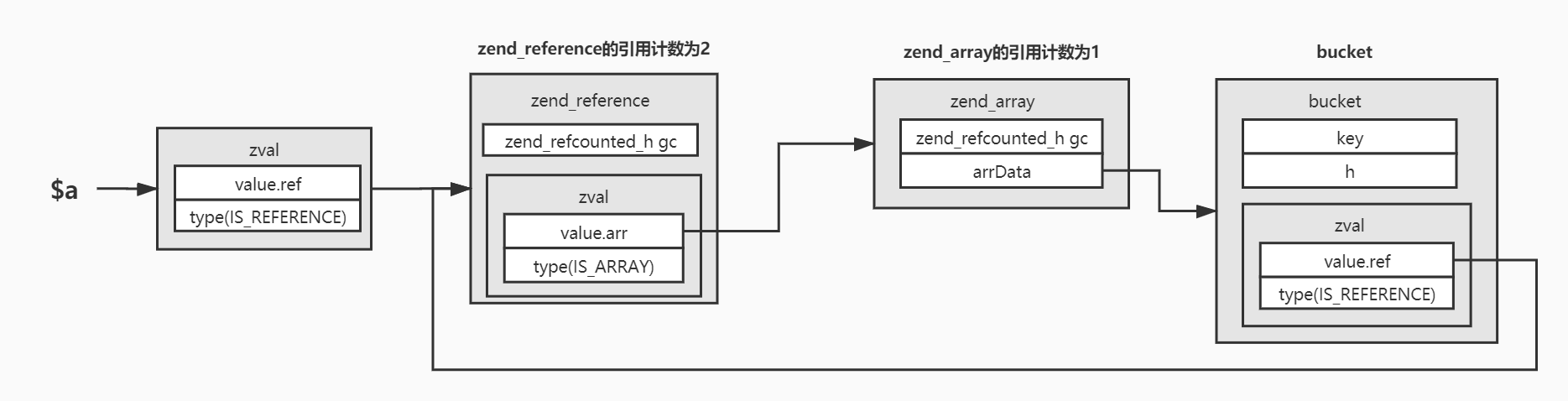 第二行,$a[] = &$a;,传址赋值,此时,$a和$a[]两个的zval的type变为10(引用类型),zval.value.ref指向一个新的zend_reference结构体,其中zend_reference结构体中的引用计数为2,而zend_reference中zval是一个type为7的结构,zval.value.arr指向一个zend_array结构体,同时该zend_array结构体中arData指针指向一个bucket,而这个bucket结构体中也有一个zval,而这个bucket中的zval的类型也为10,因为$a[]现在是一个和$a指向同一个zend_reference结构体的类型;