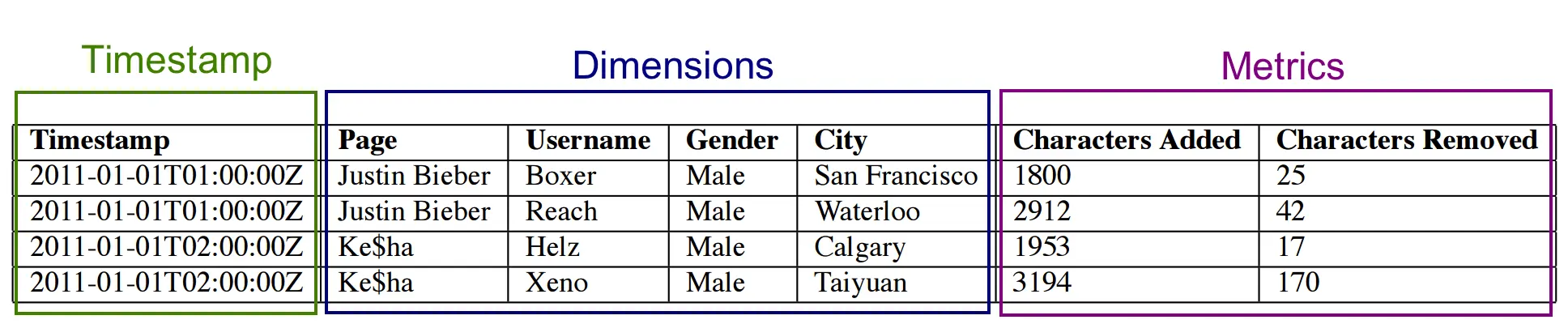 Druid 共有三种基本列类型:时间戳列,维度列和指标列,如下图所示:
