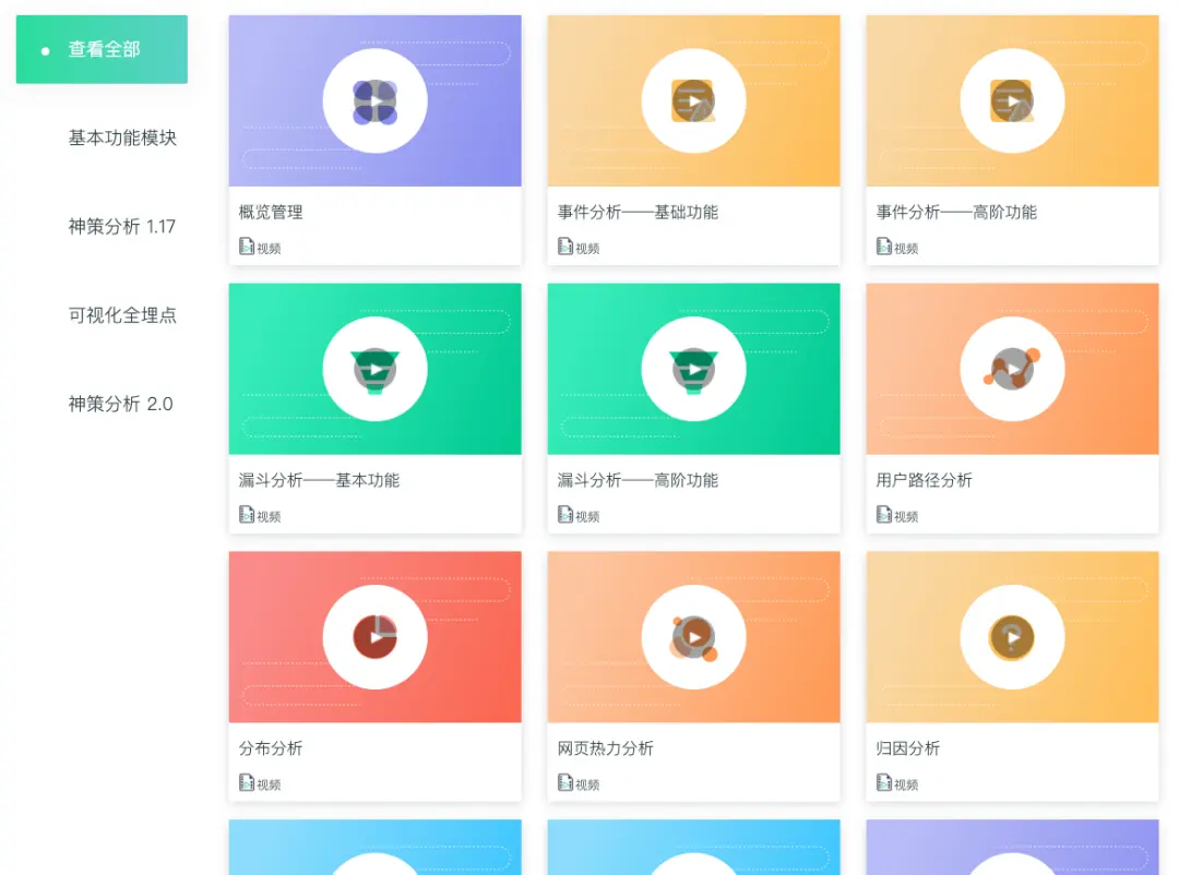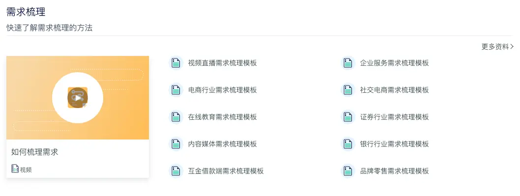 在客户服务中心提供文档+视频双重指南,让服务与应用 0 摩擦。如下图,神策提供需求梳理的方法论视频指导,同时辅以不同行业需求梳理模板。