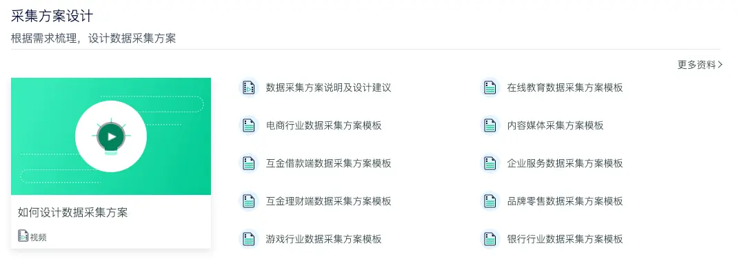 如下图在数据采集方案设计阶段提供了视频直播、电商、在线教育、内容媒体、互联网金融、企业服务、社交电商、证券、银行等数据采集方案模板,提供定制化服务指导。