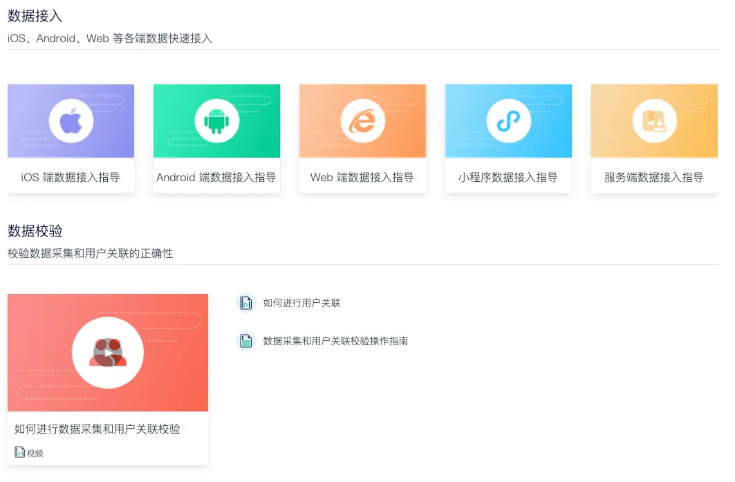 数据采集是释放数据价值第一步,客户服务中心清晰展示 Android、iOS、Web、小程序等全端数据接入和数据校验指导,为产品、运营、市场等业务分析应用,筑实根基。