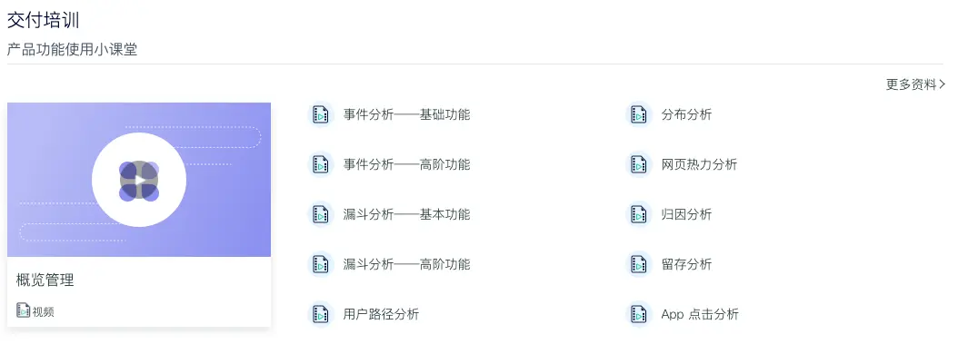 交付培训小讲堂,为你剖析产品各个功能模块,一一击破,如下图,事件分析、漏斗分析、归因分析模型及数据概览、强校验功能等均配备详解。