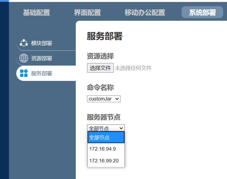 第二:先点击顶部工具条中“系统部署”,然后点左边导航中的“服务部署”,出来服务部署界面。