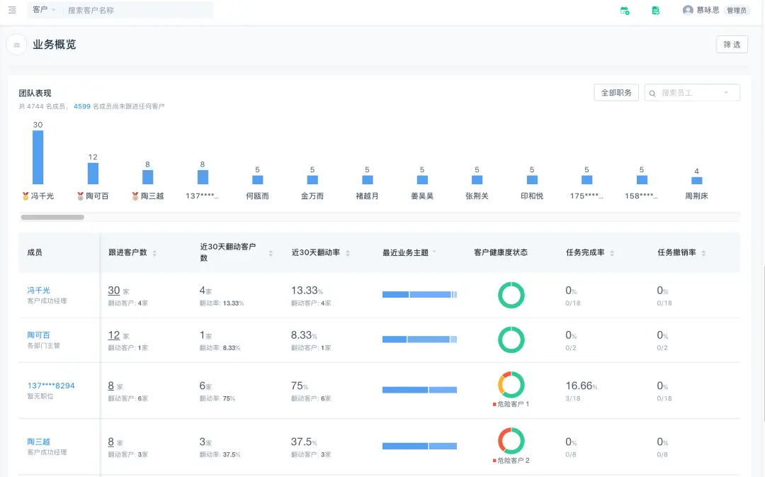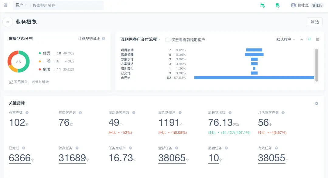 以前,客户成功管理者管理客户成功时,对于每天每位客户成功跟进了哪些客户、做了什么动作等事项,很难规范的管理。神策客景可以帮助管理层掌握每位客户成功跟进客户的全面情况,构建内部统一的考核标准。易快报的考核标准要求大家每个月都要对每个客户进行回访,如果没有神策客景这样的平台去做任务跟进,则很难考核并且落地执行。正是有了神策客景中“翻动率”的概念,管理者可对每位客户成功的跟进情况了如指掌。