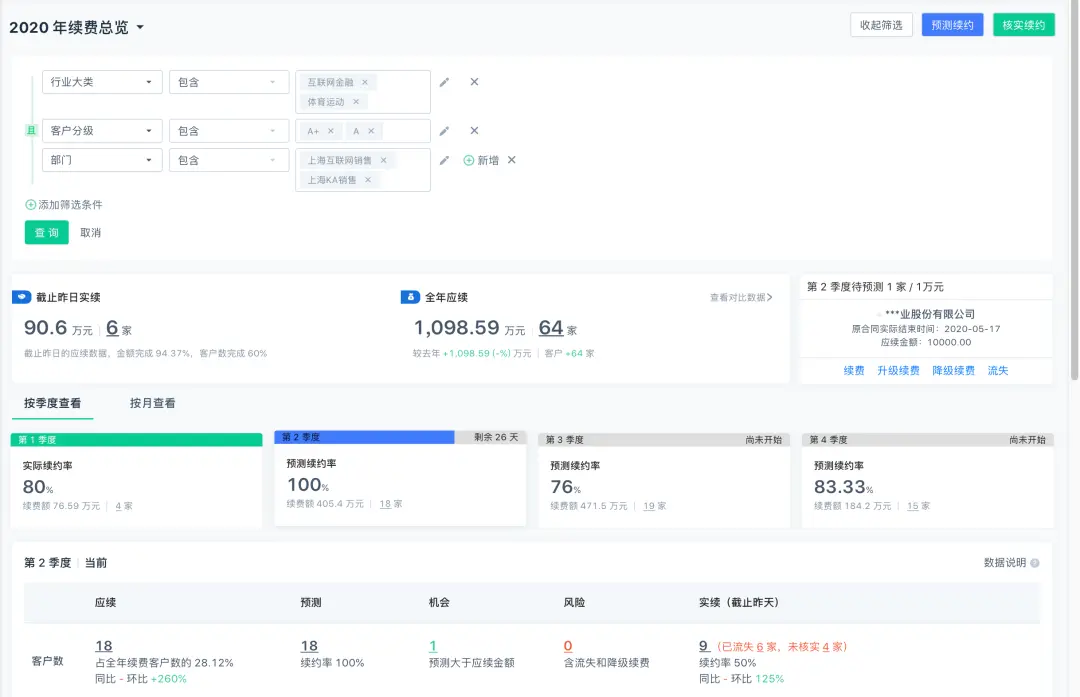 作为客户成功的管理者而言,最关心的核心指标之一就是续约率。神策客景续约总览模块,更方便将客户分类,并且可对分类的纬度分组筛选,管理者可直接打开神策客景了解续约率情况,并根据客户的体量、行业、归属部门、合同类型等多种维度,进行分类筛选查看,满足条件的续约率,做到心中有数,随时随地查看。
