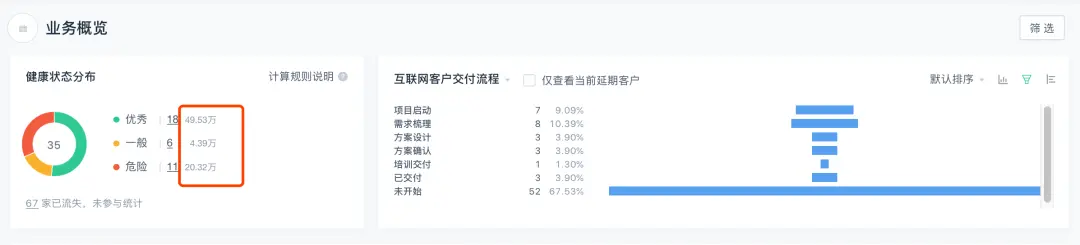 健康度状态阈值是使用“有续约记录的客户”为样本进行分布统计后得出的结果,根据阈值可分为 3 个状态:健康(使用情况良好)、一般(使用情况一般)、危险(使用情况较差)。