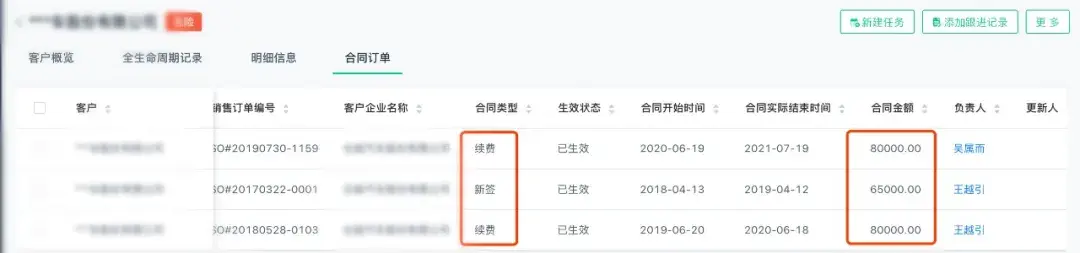 另外,每个客户成功服务的客户众多,可能无暇去关注客户的订单合同信息,即便是专门去关注该信息,每个客户的价值(合同贡献金额)也需要手动计算,并且步骤繁杂琐碎,并不便捷。