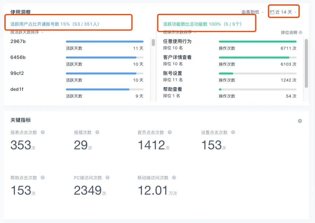 但是,通过神策客景可观察客户活跃用户数占开通账号数的比例以及变化,如果活跃用户过少,会有降级续约的风险。同时,还可以观察其使用功能是否过于单一,以及关键行为指标的变化,及时发现流失风险或者增购机会,把握最佳时机。