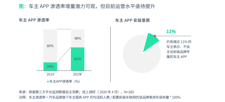 值得注意的是,现阶段较低的渗透率也暴露出了车企 APP 产品运营水平的欠缺,有 11% 的车主明确表示,他们不会主动安装品牌专属的车主 APP。