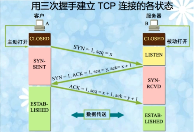 第三次握手: 客户端收到服务器的SYN + ACK包,向服务器发送确认包ACK(ack=k+1),此包发送完毕,客户端和服务器进入ESTABLISHED(TCP连接成功)状态,完成三次握手。